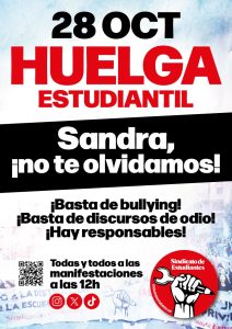 El Sindicato de Estudiantes ha convocado para el próximo 28 de octubre una «huelga» de estudiantes con el lema ¡Sandra no te olvidamos! ¡Basta de bullying! ¡Basta de discursos de odio! ¡Hay responsables! Y tras la comunicación a esta Dirección del deseo de secundar las movilizaciones en nuestro centro por parte de varios …