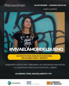El próximo 26 de noviembre de 2025, vamos a poder disfrutar en el Cine Olimpia de Cariñena, gracias a la Comarca Campo de Cariñena , de la reconocida psicóloga y comunicadora Isa Duque, más conocida como Psico Woman (@lapsicowoman) para el alumnado de 4º de ESO, Bachillerato y FP Básica. Ese mismo día por la tarde, …