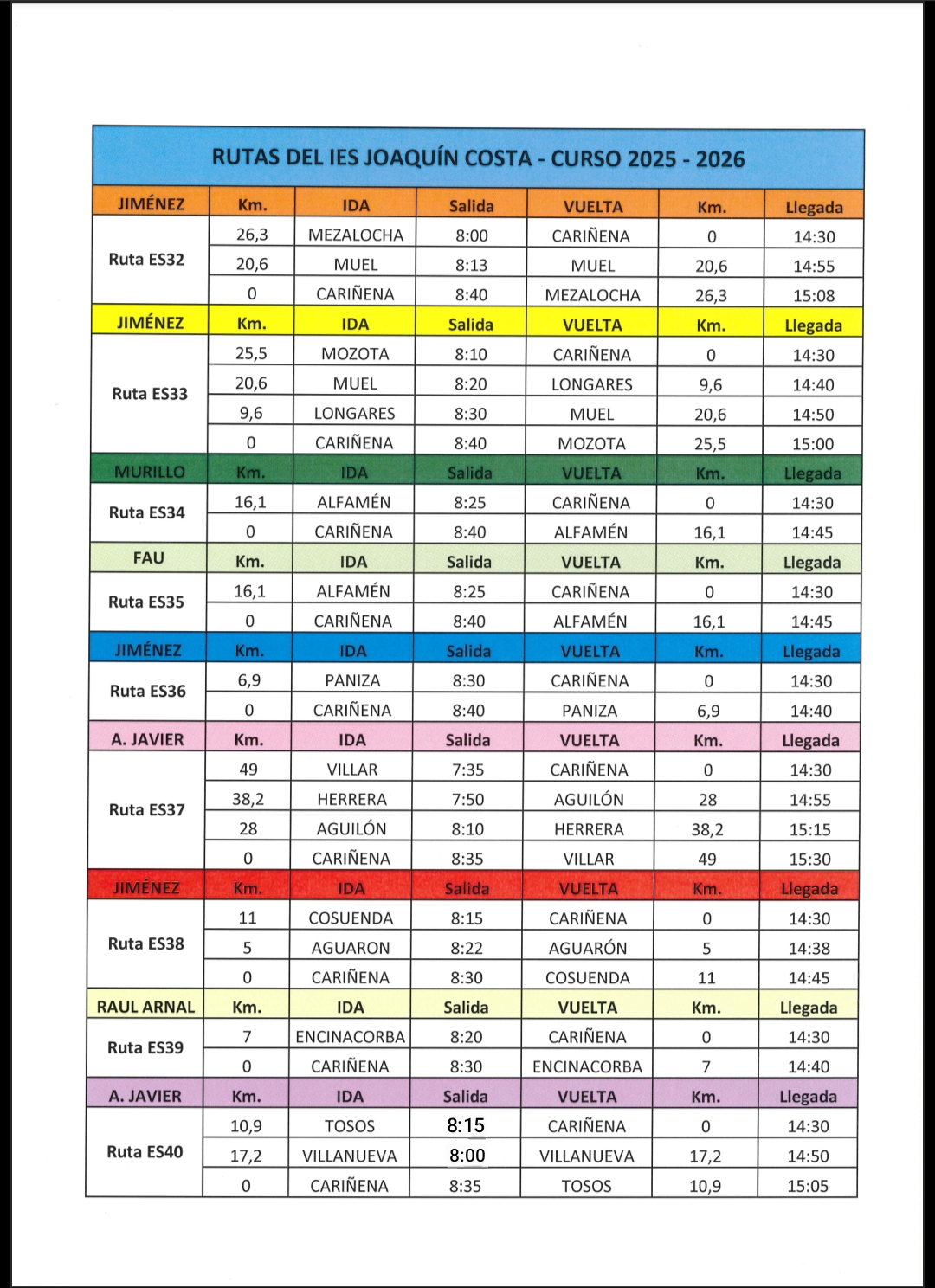 IMPORTANT: Este curso escolar 25-26, el autobús irá primero a Villanueva de Huerva (8:00) y después, a Todos (8:15).